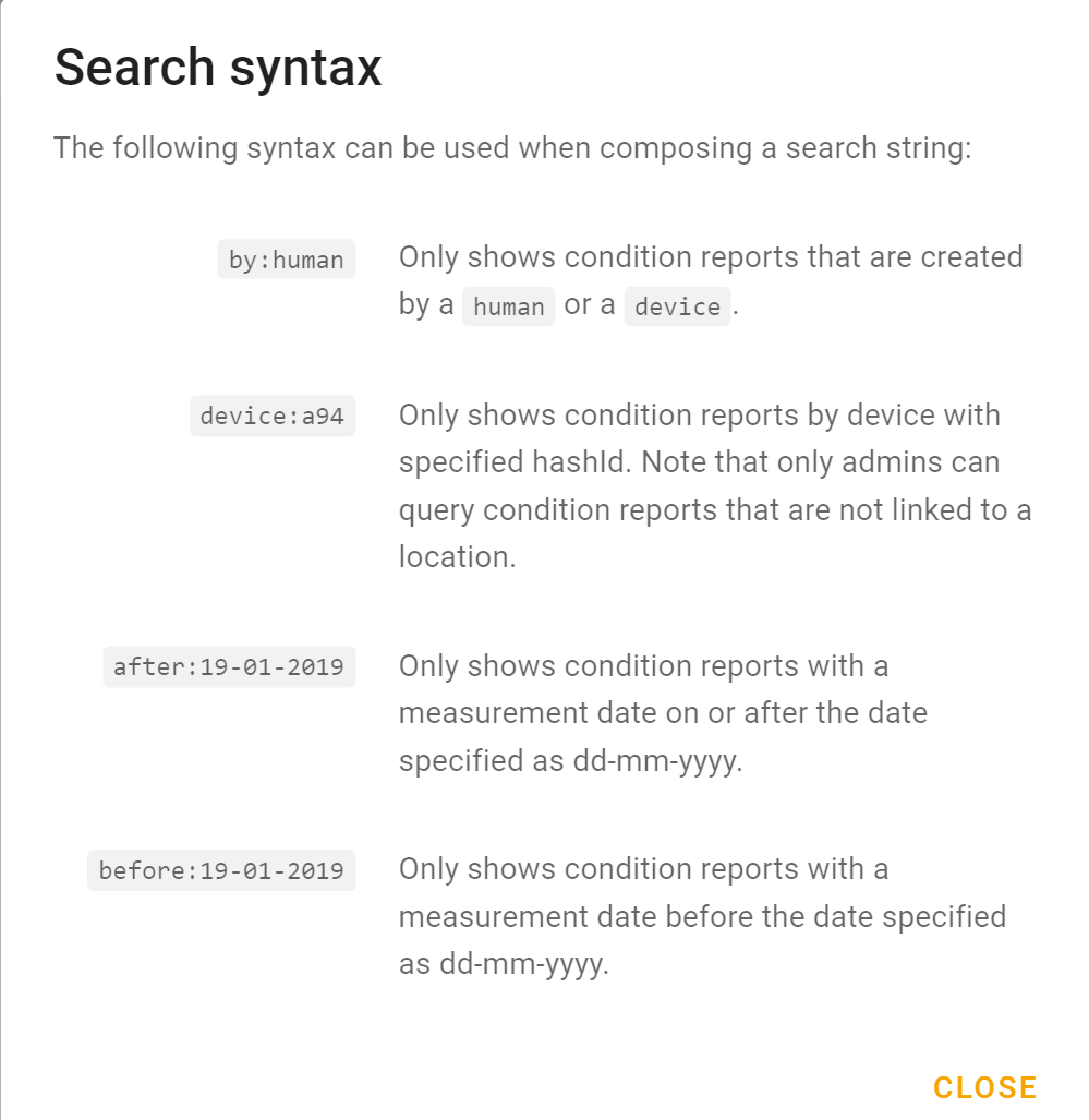 It is possible to search the condition reports with different constraints such as whether the condition report was created manually or by a device, before a certain data, by a specific device etc.
