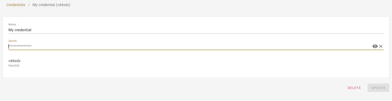 A new credential can be created by adding a name and a secret. The secret is saved and encrypted in the database. A credential can be edited, but you can’t see the previous secret. The x button reverts the secret to the previous value.