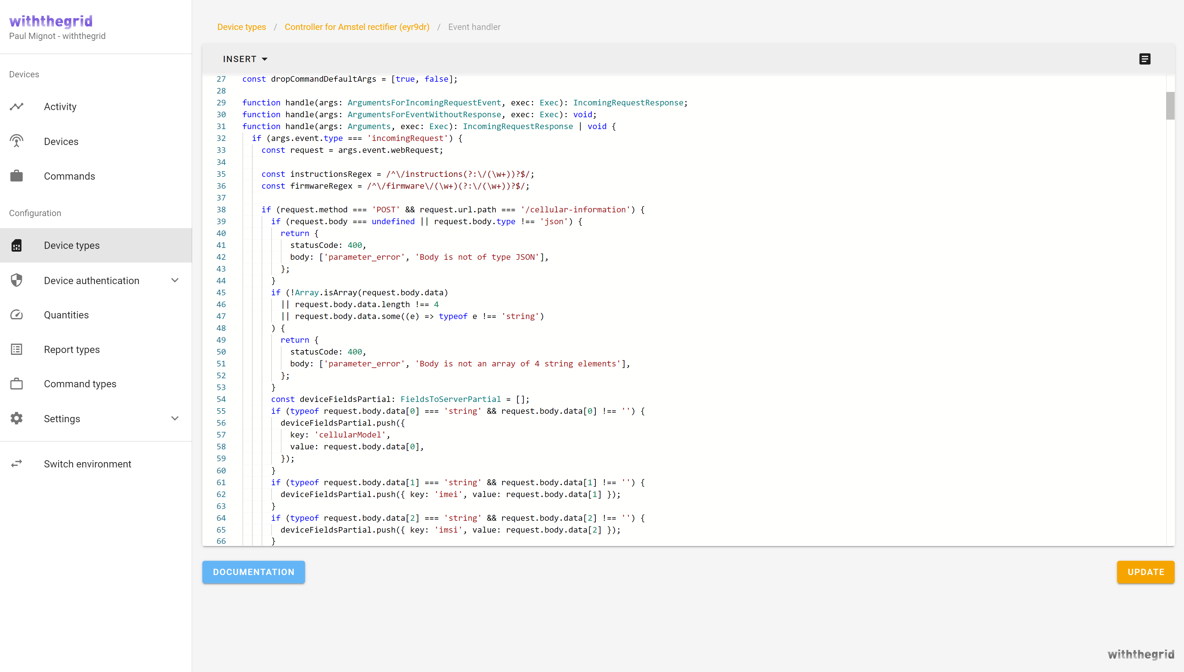 Event handlers are written in TypeScript and can parse incoming payloads into measurement reports, return instructions to devices (including FOTA) and monitor device health.