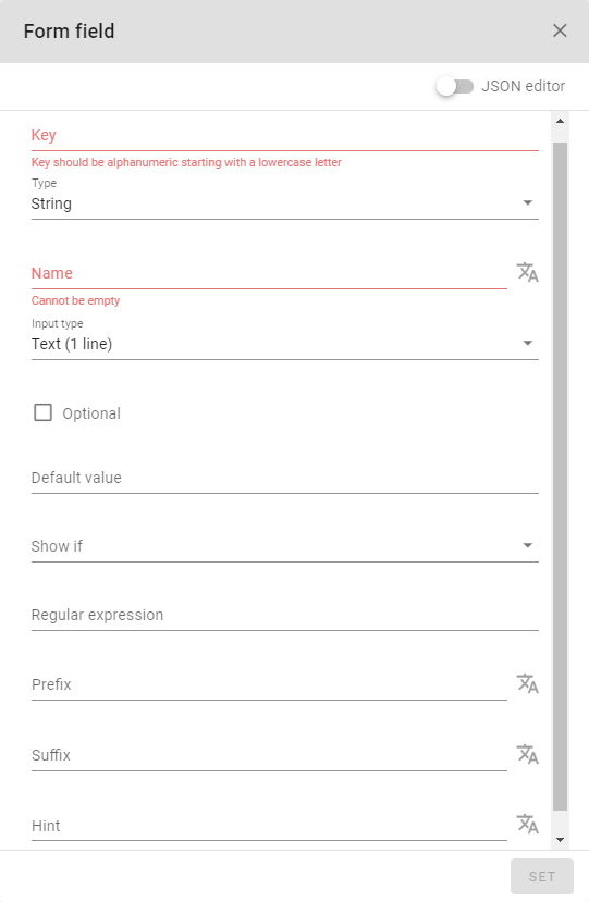Form fields are required when designing new report types but can also be used for any non-measurement related data fields. These can be added to: locations, lines, nodes (not used in the UI), location-ports, groups. Form fields can consist of any of the following elements: