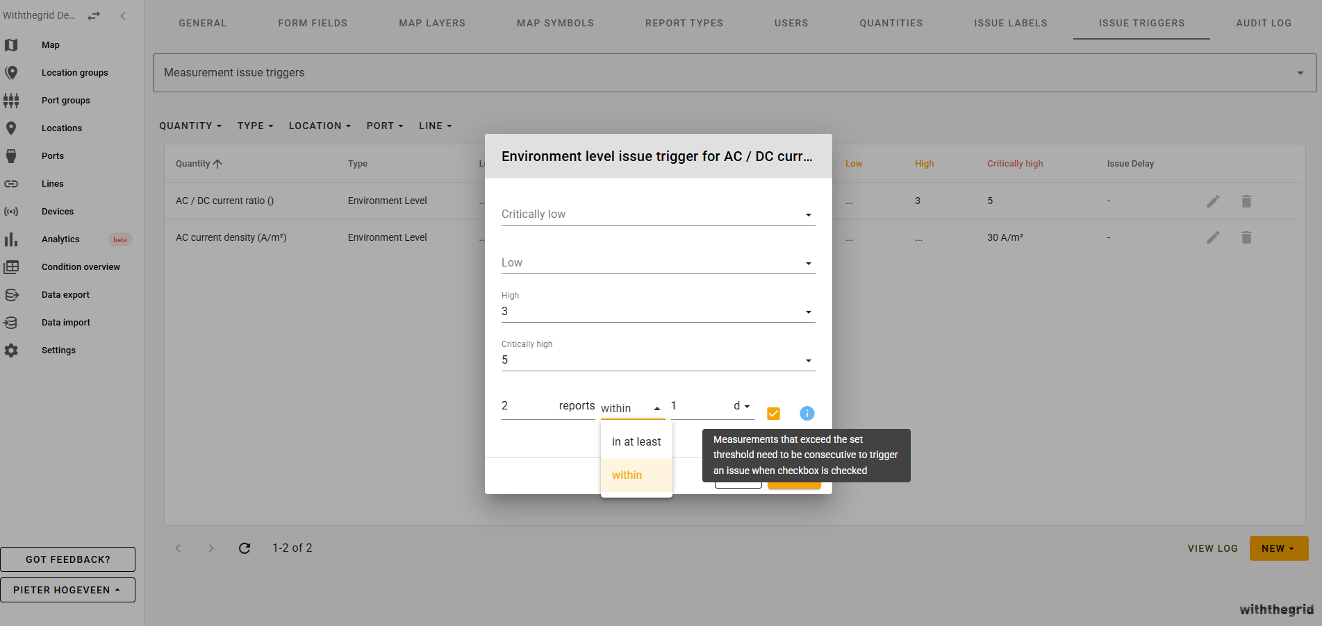 - ‘For serious or critical measurements’ automation allows users to re-use the issue for certain quantities. If quantities within the list pass the set issue-triggers, no new issues are generated. If a quantity that is not listed triggers an issue, the application will create a new one. The priority of the issue (serious/critical) will be automatically updated.