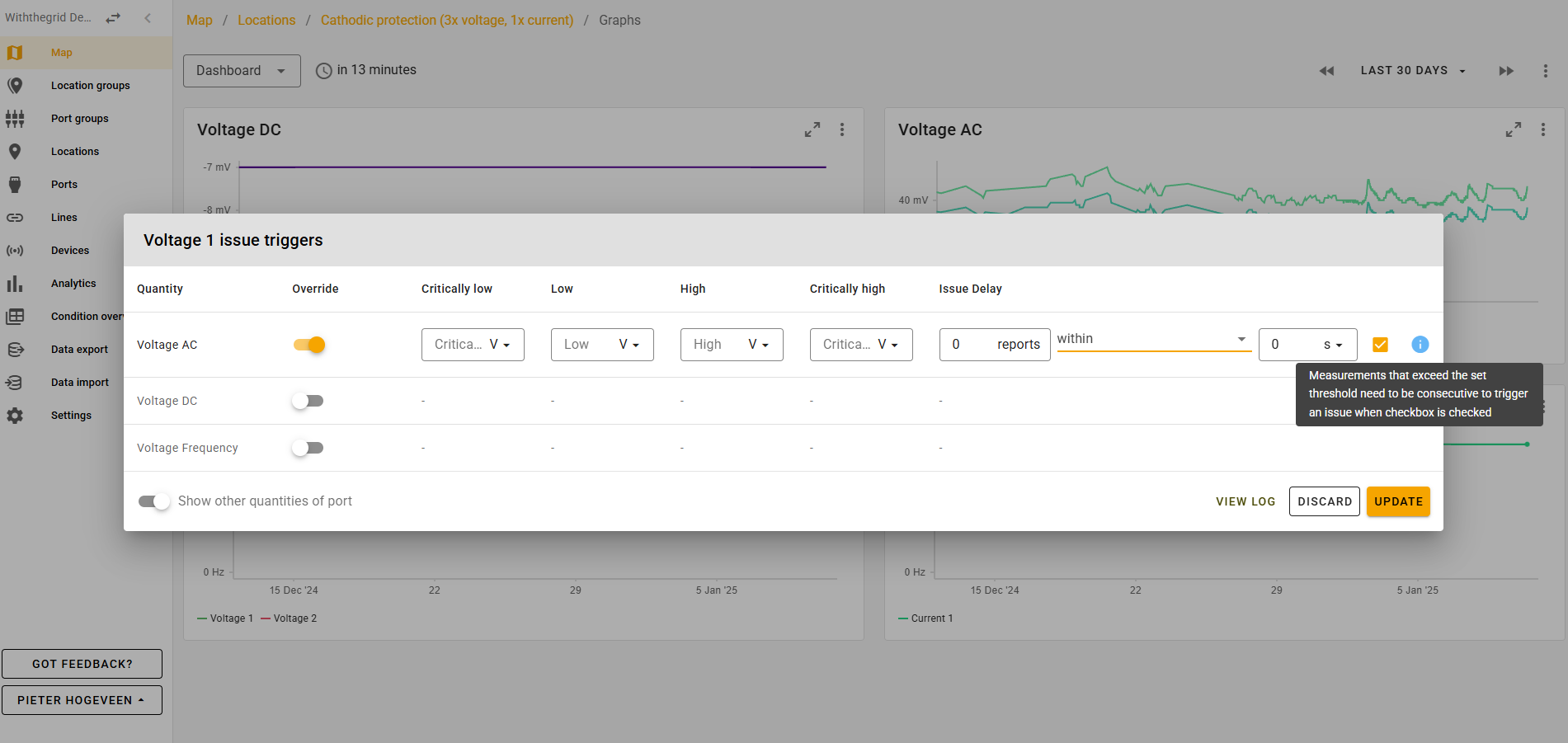 It is also possible to set an Issue Delay for an individual quantities on a port. Just click the three bullets button on the top right of the graph, select ‘Edit issue triggers’. Toggle the quantities you want to override with an Issue Delay.