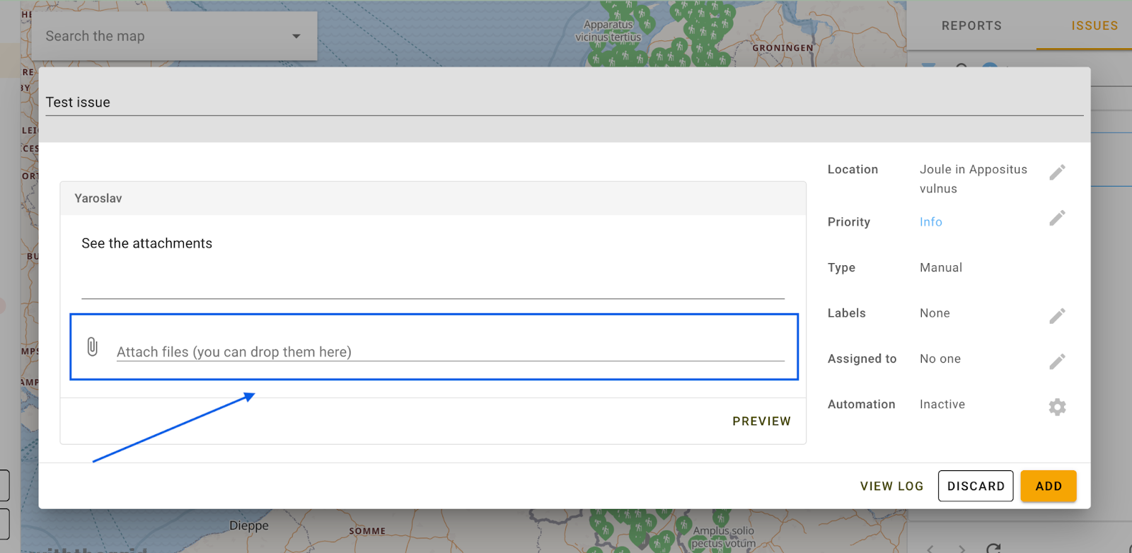 Clicking on the marked area will open file selection dialog. After submitting the files they can be downloaded by other users. If you will attach any images they will be shown inline after the text of comment instead of attachments bar.